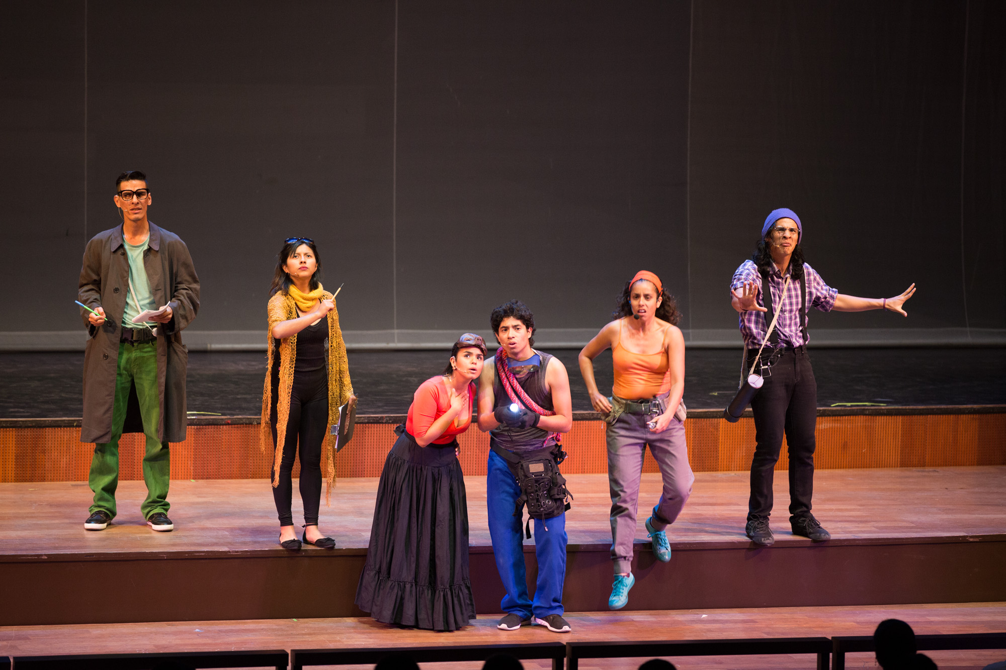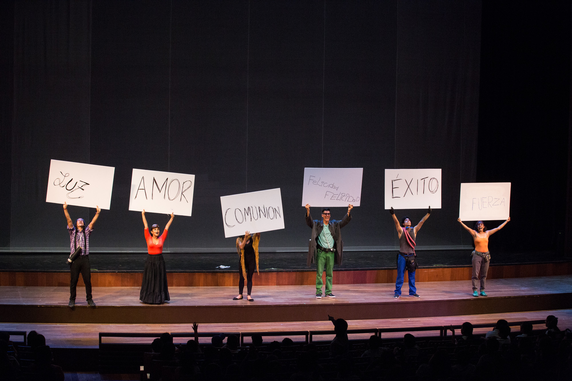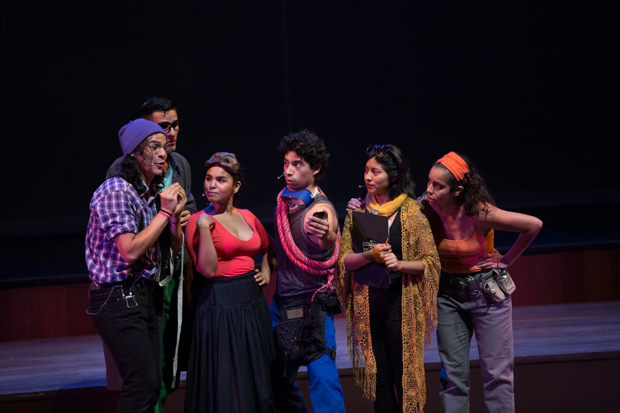 La función termina con la presentación del equipo que cuenta con características particulares, acordes al tipo de elemento que representan: Verony, la directora, con su tableta y su liderazgo; Johan, el productor, caracterizado por ser ordenado y cuidadoso; Checho, el escenógrafo, quien conoce los detalles dimensionales; Lenybeth, la técnica, entusiasta y meticulosa; Lola, la actriz, muy talentosa porque canta, baila y actúa; por último, Luis Miguel, el tramoya, una persona con gran capacidad de movimiento físico, con un ánimo tranquilo para resolver situaciones detrás del escenario y representado como una persona con discapacidad auditiva. Nos dice Vanessa Vizcarra, que el tramoya tiene esta discapacidad porque le parecía coherente las características antes mencionadas de este personaje con el hecho de que se desarrolla más el oído que la palabra, además es una persona que es capaz de entender a los demás; por lo tanto, tiene una perspectiva más serena de las cosas.